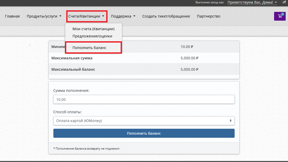 В панели управления нажать Счета/Квитанции и выбрать пополнить, далее прописываете нужную Вам сумму, способ оплаты, и жмёте пополнить.